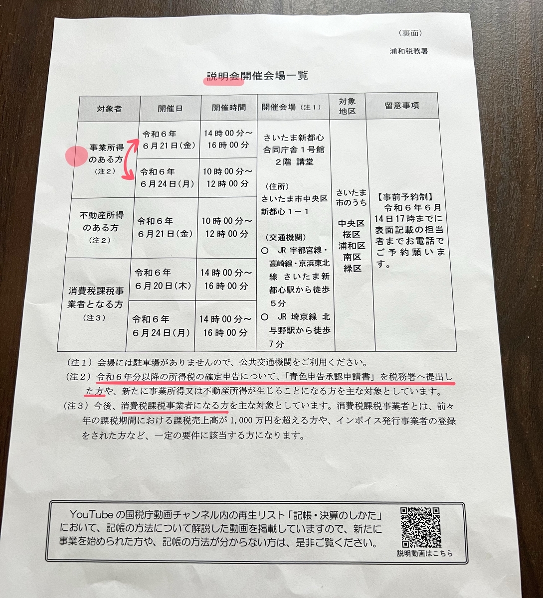 記帳説明会は日程が2つから選べた。そしてこの税務署ラブレターは今年青色申告承認申請書を提出した人や消費税課税が始まる人に対して送っているらしい。1枚目の案内状に電話予約と書いてあるので6/7に電話して予約した。当日案内状を持って浦和税務署近くのホールへ!